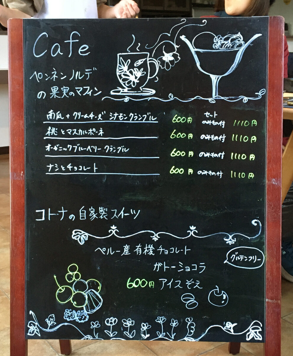 セットのドリンクメニュー、自家製スイーツも。また、店主亜衣さんのご友人で、カヌーガイドも営む安部さん、さや子さんのお店「ペンネンノルデ」のマフィンも不定期での取り扱いがあります。