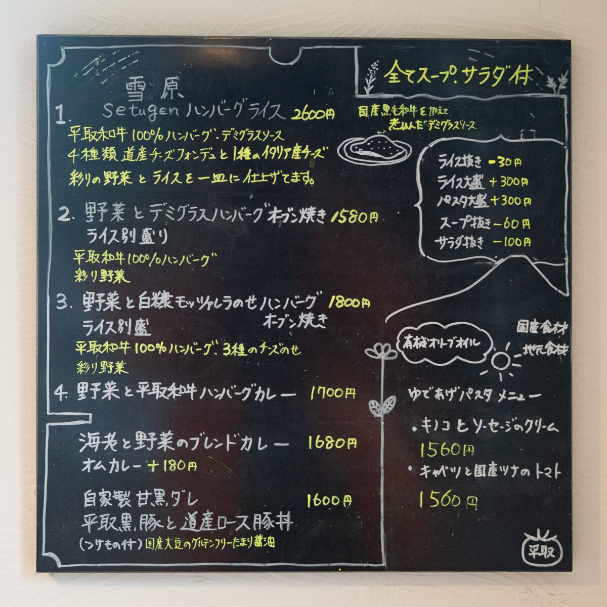 どの料理も有機オリーブオイルや国産、地元の食材を使用したこだわりの品、ということで迷いましたが、平取和牛の一品「野菜と白糠モッツァレラのせハンバーグ オーブン焼き」(スープ、サラダ、ライス付/1800円)を注文。黒板には一人前おせちの案内も。