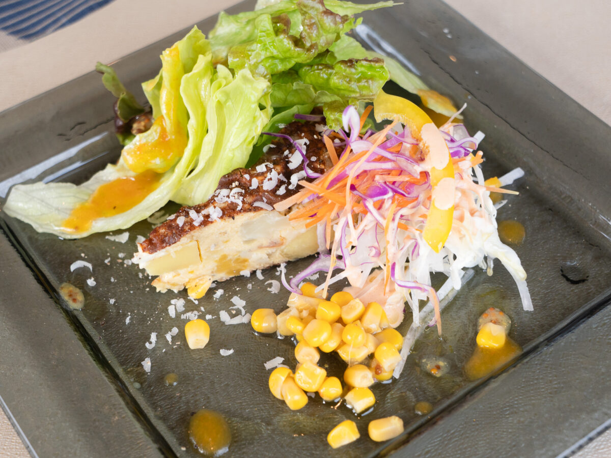 前菜のサラダがすでに豪華。具沢山のスペイン風オムレツまで添えられています。色とりどりの野菜に合わせた3種類のドレッシング、さらにすり下ろしチーズまでかかっていて、「セットのサラダ」というイメージが覆されました。