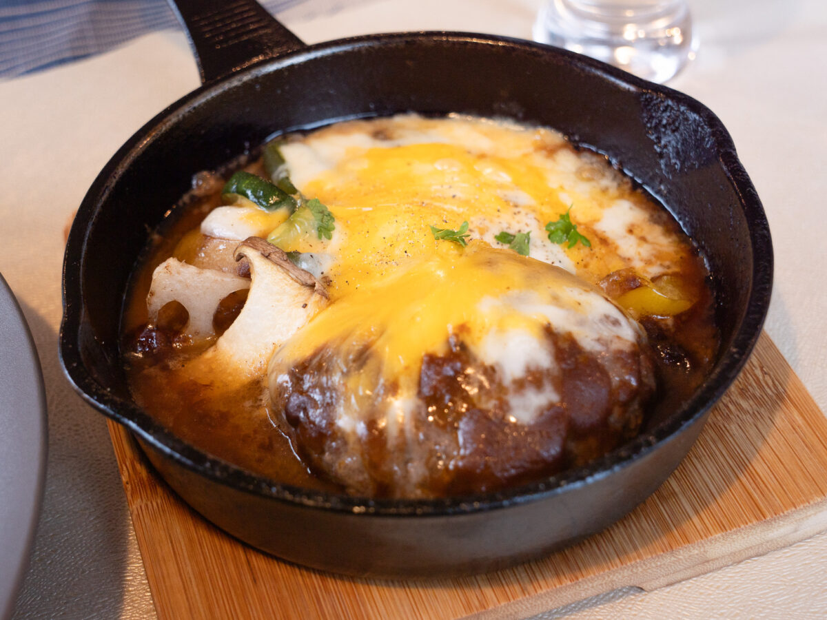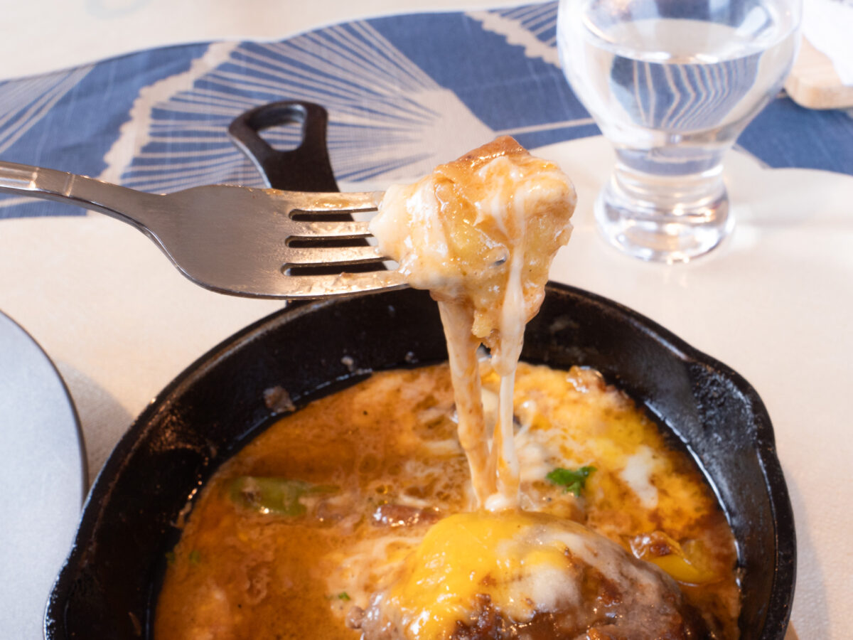 白糠モッツァレラの伸びがまたすごい。オーブン焼きハンバーグは鉄鍋で提供され、食べ終わりまで熱々だからチーズも固まらない。良質なチーズは、この量でも「もたれそうだな〜」という感じが全然しません。色から察するに、二種類のチーズがかけられているようです。贅沢!