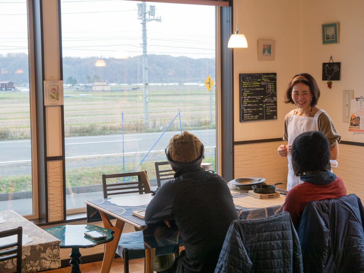 三角屋根が可愛らしく、玄関はバリアフリーになっている。この日は平取町を流れる沙流川でカヌー下りに行った後の取材。4時間の野外活動でお腹も減ったし、着込んではいてもやっぱり冷える。何か元気が出る温かいものが食べたいなぁ、という気持ちで14時過ぎにお店に到着。