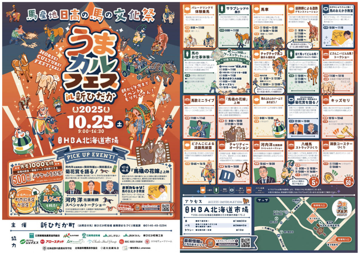 10月25日(土)HBA北海道市場という所で新ひだか町 主催のイベント「うまカルフェス」というものがあります。で、ですね~今日、新ひだか町長の大野さんから「これだけは言ってくれ」って言われたんですけど。元調教師の河内さんだとか岡田牧雄さんっていう この辺の人たちは競馬会の重鎮と言われていて、業界では凄い有名な人たちなんですけど、この人達が、うまカルフェスの翌日26日が【菊花賞】なんですけど、その菊花賞の予想なんかをしたりするらしくて。