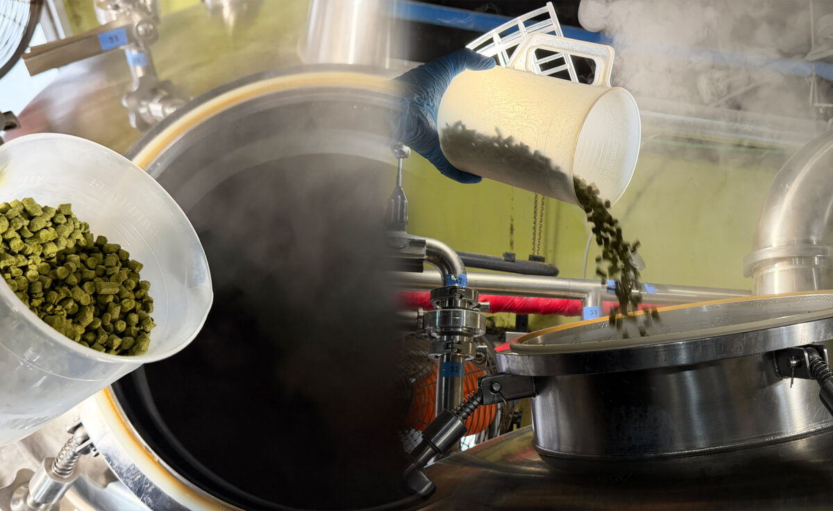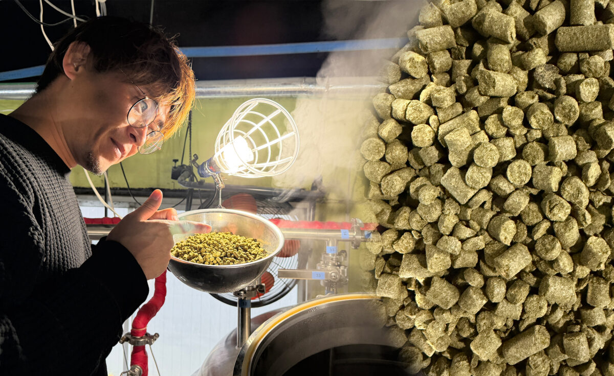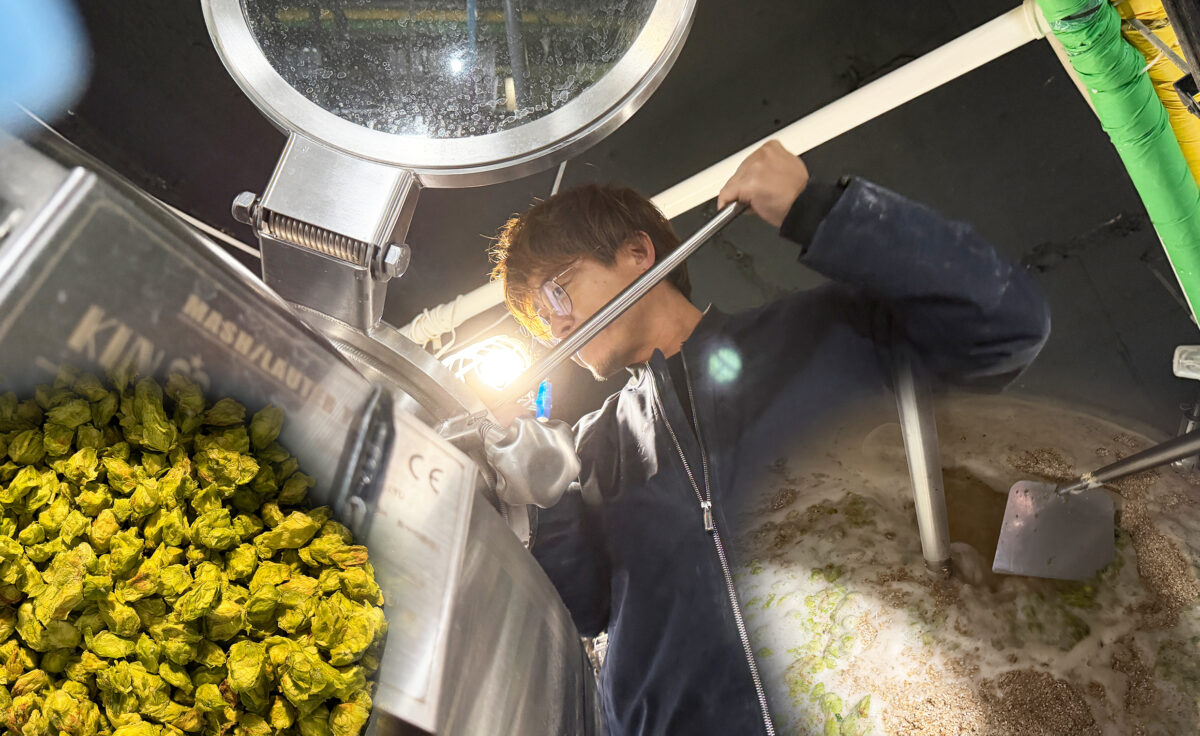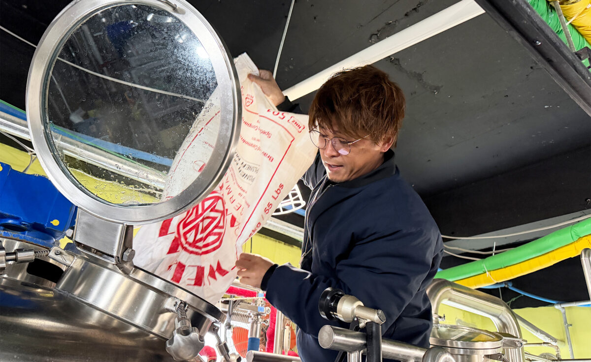 モルトと同時に北海道産のホールホップ Saaz(wassamu)を投入し、しっかり混ぜ合わせ、ベースとなるモルトエキスを作ります。