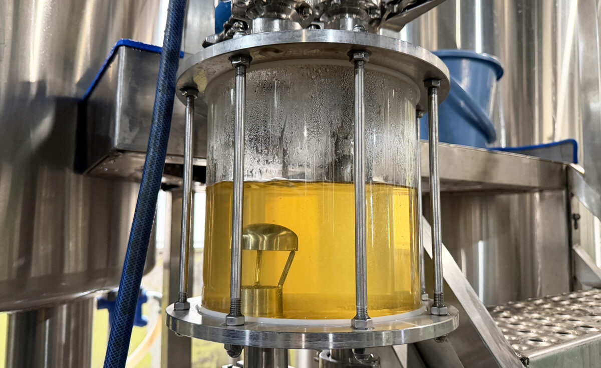 出来上がったモルトエキスを↑の写真をご覧の通り、透き通るレベルまで濾過して、煮沸を行う隣のタンクに移動させる。
