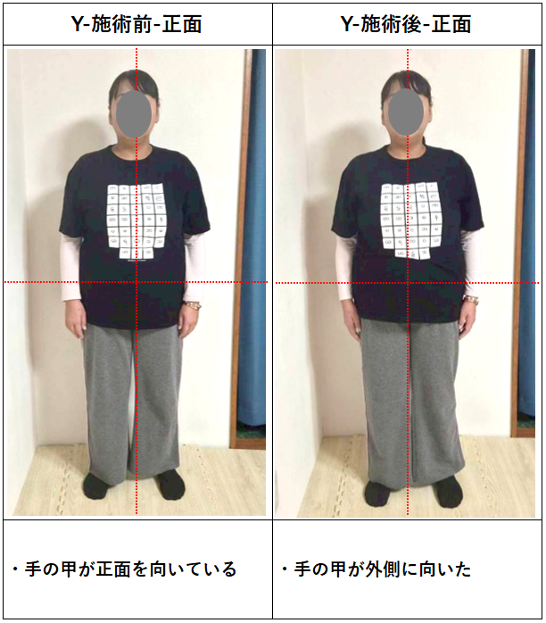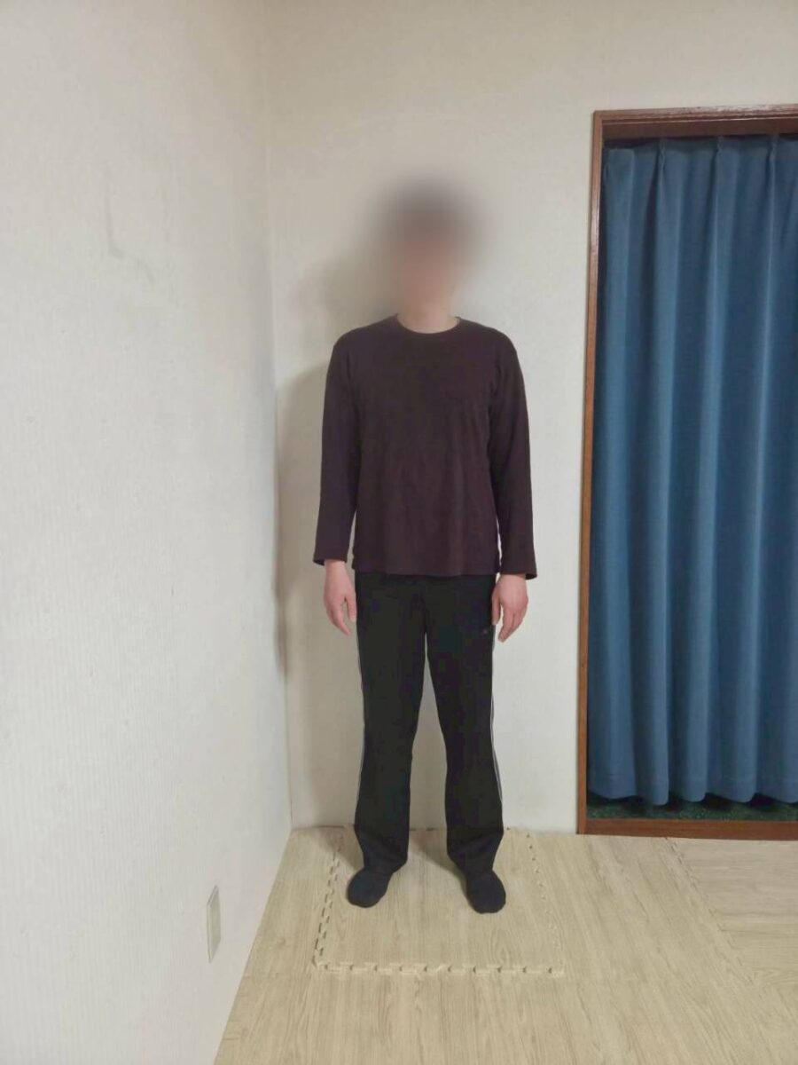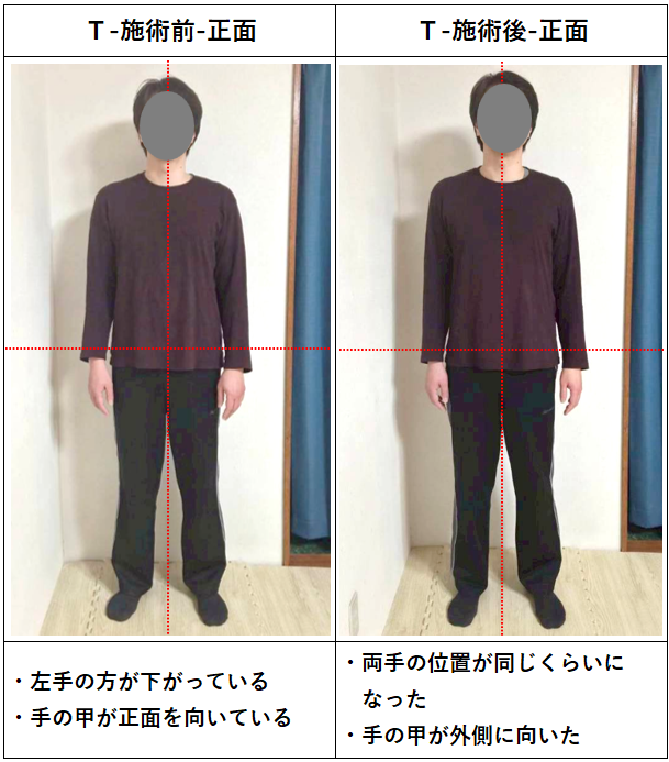 西山先生曰く、私は肩が巻いている状態だったそうで、それが明らかに改善され手の位置が正常になり、ストレートネックも改善された。足裏の感覚は全面で床を捉えるようになり、根が生えたように体幹が安定した。仰向けに寝てみると、浮いていた腰も床に接するようになり、本当に驚いた。