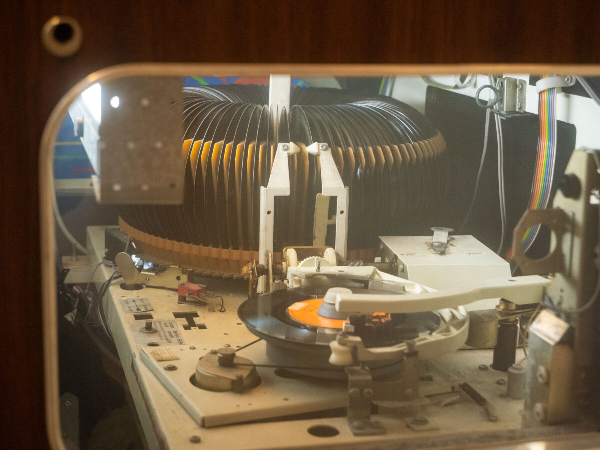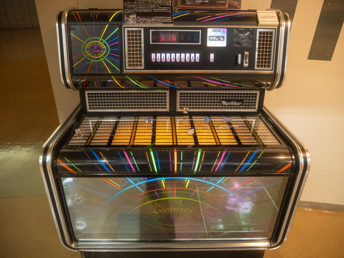 レコードが展示されているプラザの片隅で光っているのはジュークボックス。アメリカ映画に出てくる、あれです。しかも、動きます(1曲100円)。中のメカが見えるのも面白い。