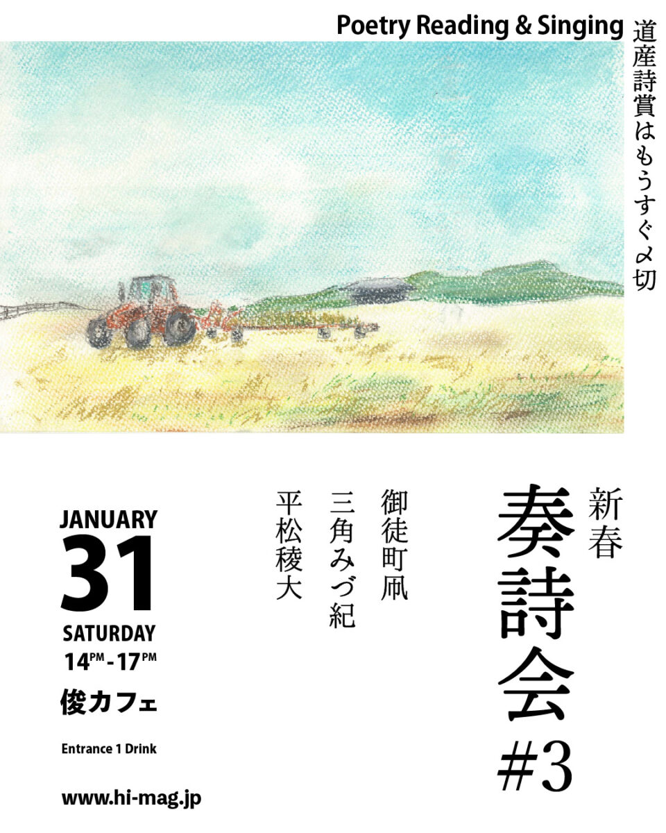 Hi-MAGでは日高を盛り上げるというミッションのかたわら、詩の公募企画「道産詩賞」、ラジオ「from the poets」と、詩に関わる活動を続けています。その根底にあるのはHi-MAGプロデューサー御徒町凧の「詩をもっと身近なものに」という気持ち。現在募集中の「第二回道産詩賞」(2026年2月28日締切)に際して、奏詩会#3を開催します。